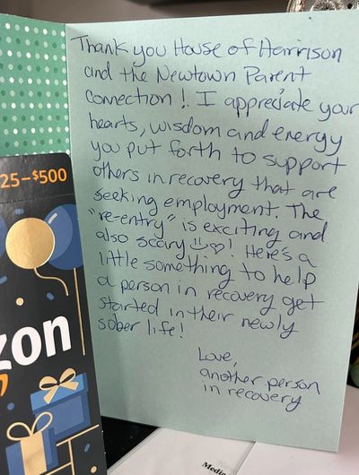 "Thank you House of Harrison and the Newtown Parent Connection! I appreciate your hearts, wisdom, and energy you put forth to support others in recovery that are seeking employment. The "re-entry" in exciting and also scary. Here's a little something to help a person in recovery get started in their newly sober life." —Love, Another Person in Recovery